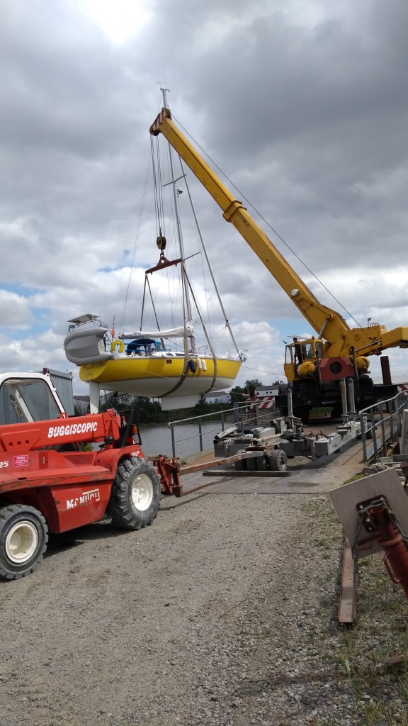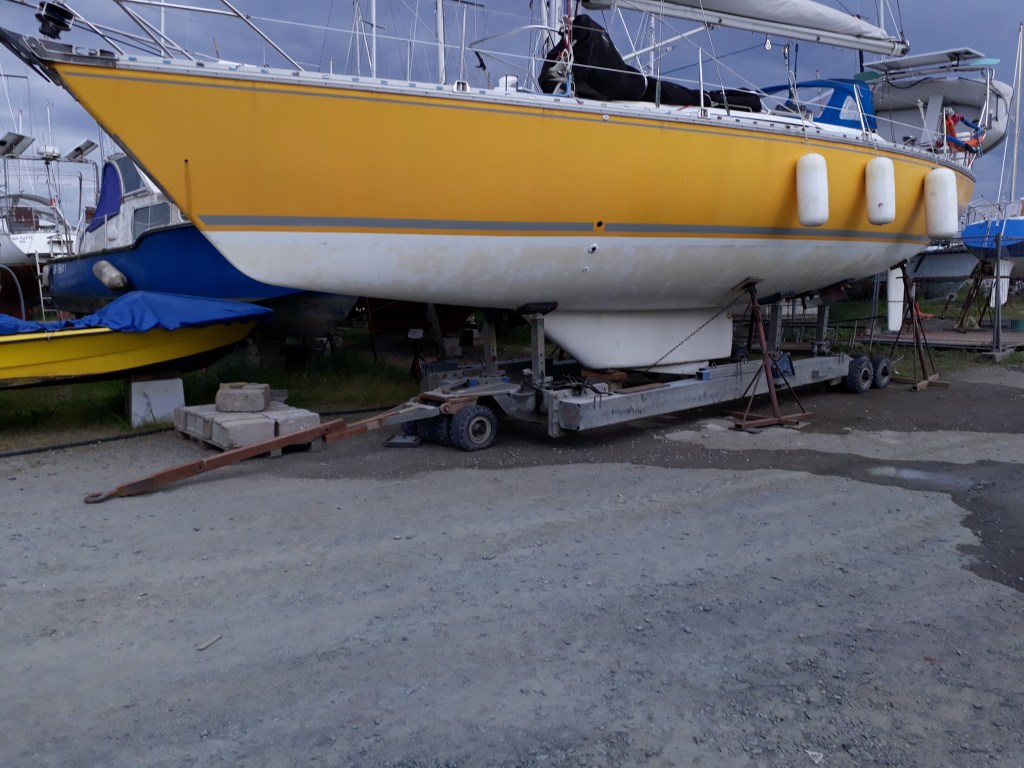2015 – FETCH EN SORTIE DE CARENAGE, PREMIERE ANNEE EQUIPE DE SON PORTIQUE. ANCIENNES VOILES LE CARENAGE TOUS LES ANS, C’EST PONCAGE A LA GIRAFE ET TRILUX33 BLANC POUR UNE CARENE TOUJOURS BELLE
